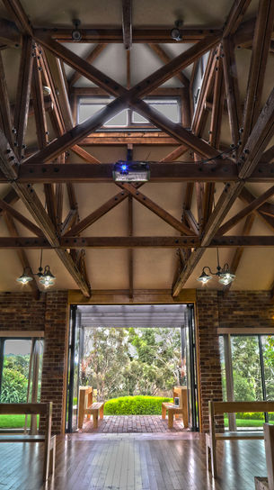 It provides a serene and focussed atmosphere that promotes connection and focus. The interior features quintessential vaulted ceilings with exposed timber trusses. Guests enter through the foyer where there is a temporary bar. A garden view is the focal point of the main room, framed by glazing which reaches the high ceilings. Guests break out onto the patio and private lawn. The Garden Room comes equipped with a PA system. Select furnishings, decor and equipment to suit your event style. Located inside the venue are comfortable restrooms.